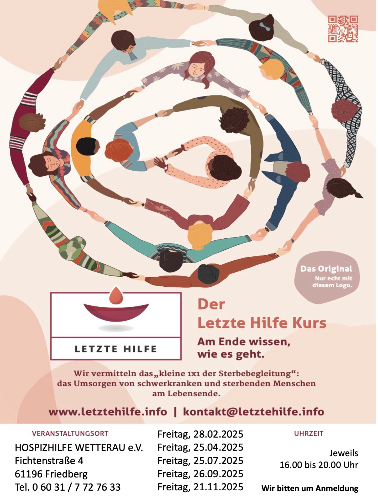 Um dieses Wissen zurückzugewinnen, bietet die Hospizhilfe Wetterau e.V. regelmäßig einen Letzte-Hilfe-Kurs an. In diesem kompakten Kurs lernen interessierte Menschen, was sie für sich und ihnen nahestehende Personen am Ende des Lebens tun können – ganz praktisch, einfühlsam und alltagsnah.